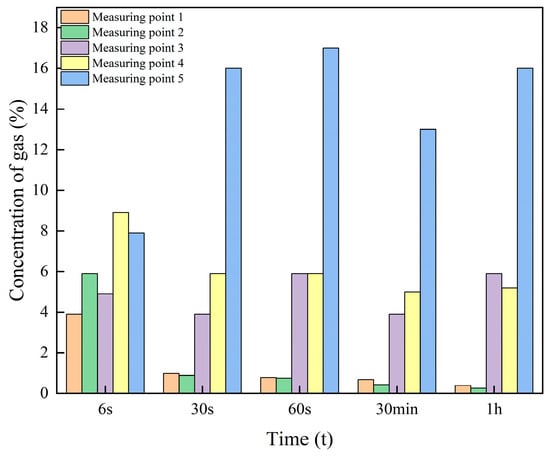 The gas concentrations at the above measurement points were monitored for 6 s, 30 s, 60 s, 30 min, and 1 h after blasting under ventilated conditions, and the field data were obtained as shown in Figure 21.