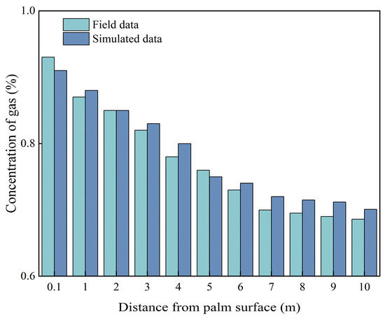 For the CJG10 optical interference type methane meter on the palm face within the 10 m range, in the gas concentration monitoring of the wind flow, measuring points were selected on the tunnel centerline in the vault. There were a total of 10 measuring points, each point having a methane meter, to collect data on the gas concentration 1 h after the blasting, and numerical simulation data were compared to the data obtained on-site. The simulation of the data is shown in Figure 22.