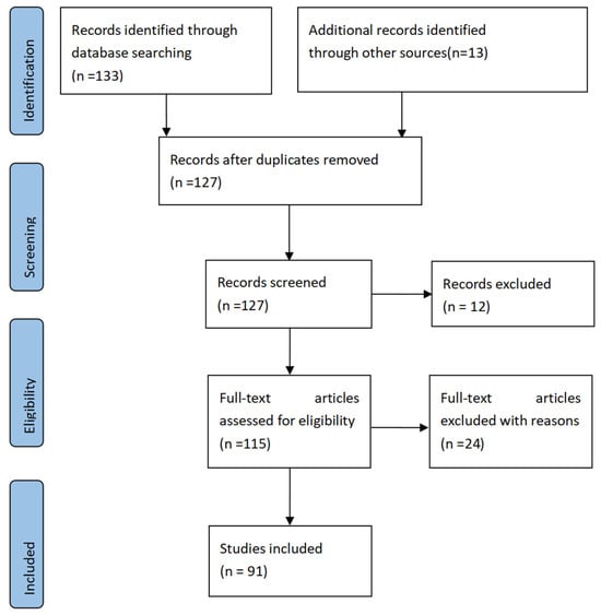 Using keywords to search for articles on different academic websites, a total of 127 articles were initially retrieved. Among them, 42 Chinese articles were retrieved using keywords such as “pollution”, “air pollution”, and “health”. After removing 13 low correlation articles, 29 were retained. Using keywords such as “low-income countries”, “air pollution”, “mental health”, and “diseases”, 85 English articles were discovered. Due to some articles only having abstracts, the content was too short, and there was limited available information; therefore, these 24 articles were excluded. In addition, 12 articles with poor correlation were also excluded, and 91 articles with high correlation were retained in the end.