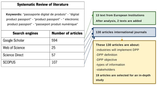 For this article, a literature review was carried out on the study variables, including the ideas, experiences, and thoughts of authors investigating this field of research. In general, publications in books, scientific articles, and theses about DPPs were analyzed, more specifically for the textile sector. However, we first introduce concepts such as the circular economy, which is interlinked with sustainable design and product lifecycle analysis, as these are concepts that interact with the introduction of this digital tool, the digital product passport. These concepts are related to sustainable business models and the creation of ecological and durable products, and this information can be contained in the DPP. The aim of this method was to delimit the context of this research, and the theoretical framework is organized into theoretical and analysis categories to specify the domain of the concepts worked on in the empirical analysis. Thus, at this stage, a literature review was carried out with the aim of (i) framing and contextualizing the emergence of the DPP in the European Union’s Sustainability Plans; (ii) establishing a definition of the DPP and the information that should be contained in this tool in order to create greater transparency in the process of creating and selling textile products; (iii) detecting the opportunities and challenges in the development of the DPP in the political/fiscal context of countries, companies, and consumers; and (iv) providing a general framework and analysis of the solutions and projects created to meet the needs of creating a universal DPP. According to [8] bibliographical research is a fundamental skill in undergraduate programs since it forms the first step for all academic activities. Laboratory or field research necessarily involves preliminary bibliographical research. Seminars, panels, debates, critical summaries, and monographs do not dispense with bibliographical research. It is obligatory in exploratory research, in defining the subject of a work or research, in developing the subject, in citations, and in presenting conclusions. Therefore, while it is true that not all students will carry out laboratory or field research, it is no less true that all of them, without exception, will have to carry out bibliographical research to prepare various assignments [8]. However, during the development of the literature review, a systematic review was carried out specifically on the digital product passport, with the aim of identifying, selecting, evaluating, and synthesizing the relevant evidence available on this digital tool proposed by the EC. According to [9] showed a systematic literature review as a type of research that follows specific protocols and aims to understand and give some logic to a large corpus of documents, especially by checking what works and what does not work in a given context. It focuses on its reproducibility by other researchers, explicitly presenting the bibliographic databases that are consulted, the search strategies carried out in each research browser, the process of selecting scientific articles, the criteria for including and excluding articles, and the process of analyzing each article. It also explains the limitations of each article analyzed, as well as the limitations of the review itself [9]. The systematic review of the literature in this study is in line with updates from the European Commission’s governing body and legislation that may be introduced in the future. To carry out this systematic review, we searched for the expression “passaporte digital de produto” or “digital passport product” or “passeport numérique des produits” in the search engines Google scholar, Scopus, Web of science, and Science Direct on 30 May 2024 (Figure 1). In the first selection, we found 130 articles from peer-reviewed international journals that mentioned this digital tool. We then analyzed 19 of these articles that developed the concept of DPP for further study. Due to the increasing development of this digital tool and the implementation of DPP in industry, there were already articles on this concept, but there were few bibliographical reviews on this concept because the legislation has not yet been defined by the EC. The inclusion criteria for this study aimed to select articles offering comprehensive insights into the concept and implementation of the digital product passport (DPP). Priority was given to peer-reviewed studies addressing the development, application, or challenges of DPPs in the textile and manufacturing industries, particularly those aligned with the European Commission’s sustainability initiatives. Only articles in English, Portuguese, French, or Spanish were considered, focusing on the role of DPPs in product traceability, lifecycle analysis, and circular economy strategies, as well as their socio-economic impact on stakeholders like producers, consumers, and policymakers. Studies featuring innovative solutions or practical case studies enriching the research were prioritized. The exclusion criteria ensured relevance and quality by excluding articles without explicit references to DPPs, those unrelated to textiles or manufacturing, and non-peer-reviewed materials. Studies focusing solely on general sustainability concepts or digital tools without addressing DPP frameworks were also excluded. Older studies (pre 2010), duplicates, and those with incomplete data, inaccessible full texts, or ambiguous findings were removed. This rigorous selection process resulted in a robust dataset of high-quality studies.
