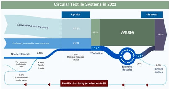 The fashion and textile sector is responsible for a significant environmental impact, being identified as the third largest cause of degradation of water resources and land use in 2020. In that year, to meet the demand for clothing and footwear for each citizen of the European Union (EU), an average of nine cubic meters of water, 400 square meters of land, and 391 kg of raw materials were needed [1]. It is estimated that production in this sector contributes to around 20 per cent of global freshwater pollution, mainly attributable to the chemicals used in dyeing and finishing clothes. In addition, the textile industry is responsible for approximately 10 per cent of global carbon emissions, surpassing the combined contribution of international air and maritime transport. According to data from the European Environment Agency, fashion and textile purchases in the EU in 2020 generated an average of 270 kg of CO2 emissions per individual, totaling around 121 million tonnes of greenhouse gases [1]. Every year, the European population consumes around 26 kilos of textiles, discarding approximately 11 kilos of that total. Although used clothing can be exported outside the EU, the majority (87 per cent) is incinerated or sent to landfill. It is therefore imperative to promote the economic and environmental benefits of prolonged use of textile products, as well as raising awareness of repair and maintenance practices that favor durability. Using high-quality materials, carefully selecting finishes, and offering clear maintenance instructions on labels are essential to empower consumers to make informed decisions during the purchasing process [10]. Textile products, particularly clothing, are made up of a variety of fabrics, materials, and accessories, such as buttons and zips, which include combinations of natural and synthetic fibers, plastics, and metals [11]. This diversity makes sustainable disposal more challenging. The textile industry largely relies on synthetic fibers and petroleum-based polymers, such as polyester, polypropylene, nylon (polyamide 6-6), and acrylic, which account for 63% of global textile fiber consumption. The production and disposal of these fibers is directly related to significant carbon dioxide (CO2) emissions. Natural fibers such as cotton, which account for around 26% of the clothing sector, are highly intensive in water and chemical inputs; the production of just 1 kg of cotton requires between 7000 and 29,000 L of water. In addition, the intensive use of pesticides and fertilizers in cotton cultivation harms biodiversity, impacts water quality, and compromises soil structure [12]. The solid and liquid waste generated by the textile production chain contaminates terrestrial and aquatic environments, with synthetic fibers persisting in the environment for millennia and releasing microplastics that disperse into both the soil and the oceans [13,14]. Textile processes often use highly toxic chemical compounds that pose substantial health risks to workers and aquatic ecosystems. The textile industry emits effluents that compromise water oxygen levels, negatively affecting aquatic biota [15,16,17,18]. In particular, wet processing—which includes fiber preparation, dyeing, printing, and finishing—as well as the production of yarns and fabrics, rely heavily on fossil fuels, contributing both to the emission of pollutants and to the increase in atmospheric CO2. In 2015, the textile sector was responsible for the emission of approximately 1.2 billion tonnes of CO2, with projections indicating an increase of 26% by 2050 [17,19]. The global production of textiles and clothing is on a steady growth trajectory, with an expected acceleration. Clothing sales have almost doubled in the last 15 years [15,18]. In 1975, the global production of textile fibers totaled approximately 23.9 million metric tonnes, rising to 98.5 million tonnes in 2017 and reaching 111 million tonnes in 2019 [10]. Projections suggest that annual consumption of clothing, which was 62 million tonnes in 2019, could reach 102 million tonnes by 2030 and expand to 160 million tonnes by 2050 [10]. According to data released by the European Parliament in 2024, less than half of used clothes are stored for reuse or recycling, with only 1% of used clothes being recycled into new products, given that the technologies that enable this recycling into virgin fibers are still in the development phase [11]. The role of legislators is crucial in promoting increased recycling. In 2022, the European Commission presented a Strategy for the Sustainability of Textiles, which includes extending the useful life of textiles by recycling and reusing materials in new quality products [10]. The Waste Framework Directive requires EU member states to establish separate collection systems for textile waste by the beginning of 2025 and imposes new textile recycling targets. To meet these new regulations, collection, sorting, and recycling infrastructures will need to adapt quickly [11]. In 2022, a McKinsey & Company report entitled “Scaling textile recycling in Europe—turning waste into value” indicated that closed-loop recycling—which involves reusing pre- and post-consumer textile waste to produce new yarns and fabrics—could be applied to between 18% and 26% of raw textile waste in Europe by 2030 [20]. Companies such as Renewcell, Ambercycle, Circ, Gr3n, and Worn Again Technologies are at the forefront of recycling textile waste into new products [21]. Between 2021 and 2022, Textile Exchange published an annual materials market report, highlighting that closed-loop reuse and post-consumer recycling increased from 0.06% to 0.18% of total material use (8623 tonnes) between 2018 and 2020 and to 0.6% of total material use (37,153 tonnes) between 2018 and 2021 [22]. The Sankey diagram shown in Figure 2 shows the division of materials into three main categories: conventional (virgin) materials (44 per cent), renewable materials 