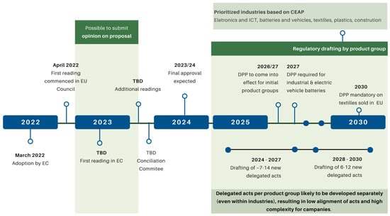 In 2022, the first phase of the CIRPASS (Collaborative Initiative for a Standard-Based Digital Product Passport for Product-Specific Data Sharing in a Circular Economy) was launched, lasting 18 months, following the proposal of the Sustainable Products Regulation (ESPR). The central aim of this initiative was to develop a structured concept for the digital product passport (DPP), establishing an inter-sectoral data model that promotes the circular economy. Initially, the project focused on three strategic sectors: electronics, batteries, and textiles. The consortium leading the initiative consisted of 30 global partners, including industry organizations, digital companies, international standardization bodies, regulatory authorities, and NGOs, reflecting a collaborative and multi-sectoral approach. The DPP regulation is currently being drafted by the European Commission, with final approval expected in 2024 and implementation of the first product groups anticipated in 2026/27 (Figure 4) [54].