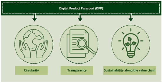 The development of this passport should assist both consumers and businesses in making informed choices when purchasing products, facilitate repairs and recycling, and enhance transparency regarding the environmental impacts of products throughout their lifecycle (Figure 6). The DPP should also aid public authorities in conducting better checks and controls [58]. According to the authors Adisorn, Tholen, and Götz (2021), the objectives associated with the DPP can be identified as follows: The DPP is committed to offering clear and accessible information on the origin, composition, and lifecycle of products. This helps consumers to make well-informed decisions and builds trust across the supply chain [54].