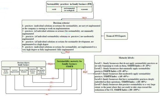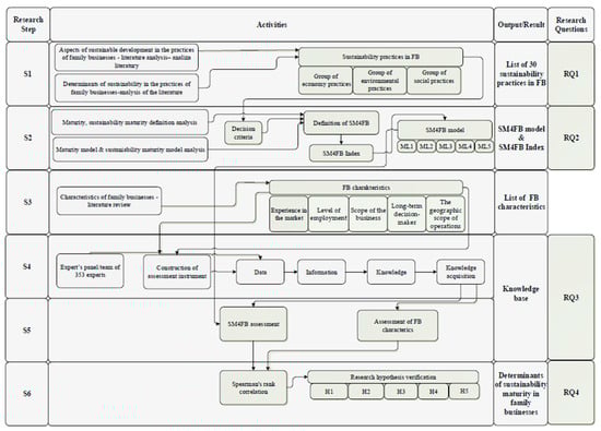 As a result of the integration of epistemological and utilitarian research questions, the sustainability maturity for family business (SM4FB) model was developed, including assessment subjects, objects, maturity levels, and a calculation procedure. To develop and present SM4FB and verify the research hypotheses, we followed the research procedure shown in Figure 2.
