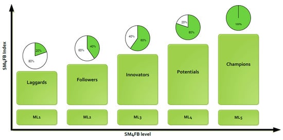The SM4FB model is used to measure the level of sustainability practices implemented in a family business. The model has five levels, and companies are positioned based on the value of the multiplicative SM4FB Index, which is calculated according to Equation (1):