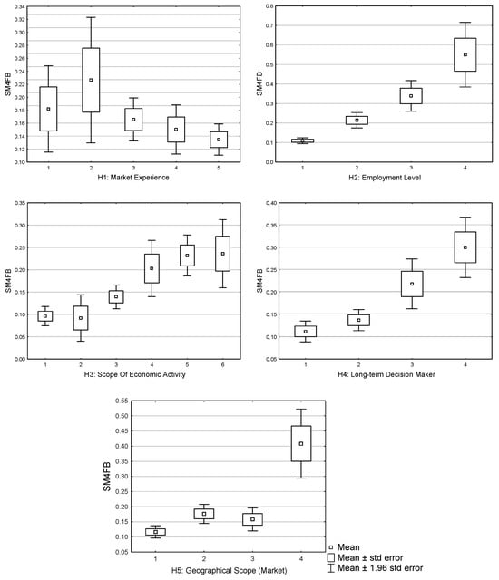 This data set covers the scope of maturity assessment (RQ1) and the maturity assessment criteria (RQ2). The scope of maturity assessment is the set of sustainability practices used by a family business and assessed for maturity. The sources of knowledge about the assessed practices are experts who are involved in family businesses. The decision to select experts should be based on their knowledge, experience, and capabilities, as maturity will be assessed based on the information they provide. The decision criteria are descriptions of maturity levels, as the decision is simply to identify the maturity level at which the entire organization is in terms of sustainable development. Having all the necessary input data, it is then necessary to design a way to extract knowledge about the value of the maturity assessment criteria, how to process this knowledge, and how to integrate the processed knowledge about the value of the maturity assessment criteria (RQ3). Finally, from a utilitarian aspect, we want to determine the endogenous and exogenous factors that determine the sustainability maturity of a family business (RQ4). To this end, we used ANOVA [] and Levene’s test of homogeneity of variance [] to test five research hypotheses: