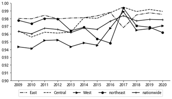 As shown in Table 3, the average value of the comprehensive development index of NU subsystem was 0.297–0.331, indicating that the average level of NU in China was not high. The composite index of NU rose slightly, from 0.297 in 2009 to 0.331 in 2020, an increase of 11.66%. Next, the region and province differences in NU comprehensive development index were studied. Based on the National Bureau of Statistics of China, Chinese provinces are divided into four regions: eastern, central, western, and northeastern.