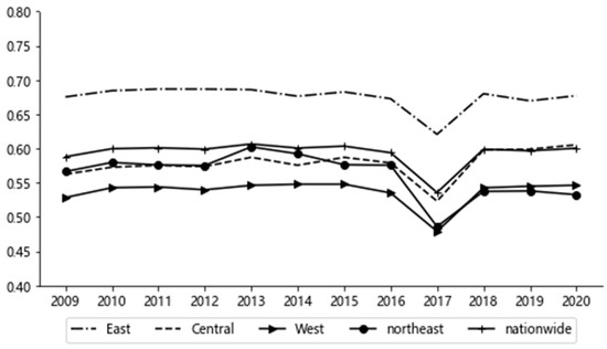 Figure 2 shows that the coordination degrees of the whole country of China and the east, northeast, central, and western regions were lowest in 2017; the decrease was not very significant. That might be due to the influences of environmental factors; the coordination level in a certain year may not be effective, and due to the mutual influence between regions, caused the coordination level to decrease. Subsequently, after adjustments in urbanization and environment policies, the coordination level rebounded. The whole country of China was between low and moderate coordination (0.594); the eastern region was in moderate coordination (0.675), and the central region was in low coordination (0.578) and reached moderate coordination (0.605) in 2020, The northeast was in low coordination (0.561), and the west was in low coordination (0.537).