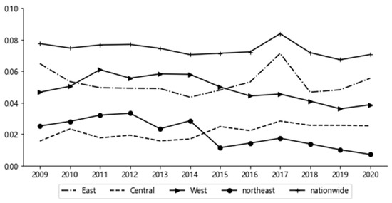 (1) Intra-regional differences in China’s NU and EE system coordination. From Figure 3, it can be seen that China’s NU and EE system coordination had a small intra-regional difference, with an average Gini coefficient of 0.0740, which was relatively stable, and only slightly increased to 0.0838 in 2017. The average values of the Gini coefficient of different regions in China were eastern region > western region > central region > northeast region. The gap in intra-regional differences in China’s NU and EE system coordination in northeast region narrowed fastest. The intra-regional difference in the western region of China’s NU and EE system coordination gradually narrowed. The intra-regional difference in China’s NU and EE system coordination in the central region gradually increased.