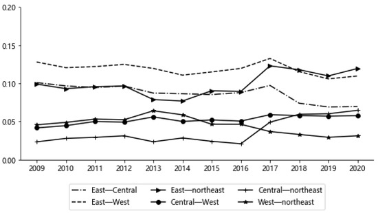 The differences between east–west, east–northeast, and east–central regions were relatively large. The regional differences between east–central and east–west displayed downward fluctuation. The Gini coefficient between east–northeast regions presented upward fluctuation, and regional difference increased by 20.61%. Relatively small differences among Chinese regions were observed between the central–northeast, west–northeast, and central–west regions. However, the difference in central–west regions and central–northeast regions slightly increased. The difference in west–northeast regions had decreased by 31.58%.