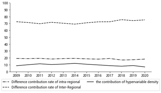 Regional differences and differences sources were described by the Dagum Gini coefficient. The Dagum Gini coefficient of China’s NU and EE system coordination from 2009 to 2020 is displayed in Figure 3, Figure 4 and Figure 5.