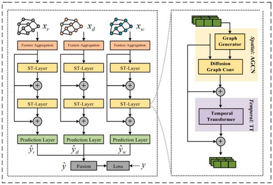 For extracting temporal dependencies, the mainstream methods include the RNN and its variants, TCN, and attention mechanism. The RNN and its variants are proposed for time series data and are powerful for capturing temporal dependencies. Lv et al. [28] proposed a Temporal Multi-Graph Convolutional Network (T-MGCN), which used the GRU to learn temporal features. But RNNs suffer from the issues of gradient explosion or vanishing during training, as well as inaccurate determination of sequence lengths. Although the GRU and LSTM can avoid the vanishing gradient problem, there still exist limitations on their scalability for modeling long sequences. The CNN is also effective and efficient for extracting temporal dependencies. Guo et al. [29] proposed an attention-based spatial–temporal graph convolutional network (ASTGCN) using the CNN to learn dependencies from nearby time slices. Qu et al. [30] designed a spatial–temporal periodical adaptive graph contrastive learning (ST-A-PGCL) model, adopting dilated causal convolution to capture temporal dependencies, capable of handling long sequences in a parallel computation manner. Although dilated causal convolution [12], refs. [31,32], improves the CNN’s ability to model long sequences by increasing the receptive field, it may still overlook some time steps during global operations, leading to information loss. The attention mechanism is also powerful for modeling sequential dependencies. Zheng et al. [33] proposed a graph multi-attention network (GMAN), which designed a temporal attention mechanism to adaptively model non-linear temporal correlations. Many studies have proposed some variants of the transformer [34,35] to capture long-range dependencies, achieving promising results. Represented by transformers with the highly parallelizable self-attention mechanism can adaptively capture long-range temporal dependencies from input sequences of varying lengths.