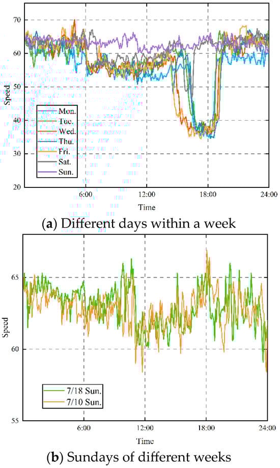 The traffic speed data exhibit clear daily and weekly patterns. For instance, the traffic speed data trends on different weekdays within the same week, as well as on Saturdays across different weeks, are generally similar, as illustrated in Figure 2. Considering these patterns can be beneficial for the model to more accurately predict traffic speeds.