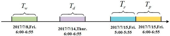 consists of time series segment from the past several weeks corresponding to the prediction time period, as shown by the green part of Figure 3. is the input time length of daily-periodic segment. Usually, the traffic patterns on Saturdays are quite similar to those of the previous Saturdays, while there might be significant differences in traffic patterns on Fridays, as illustrated in Figure 2. Therefore, considering the weekly periodicity of traffic speed is meaningful.