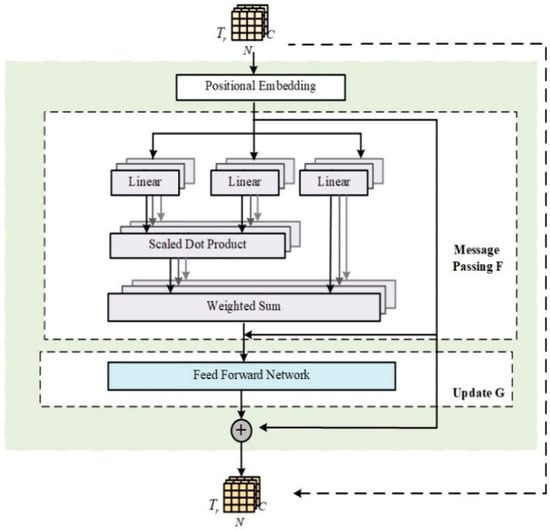 The architecture of the temporal transformer (TT), as shown in Figure 5, is used to capture long-range temporal dependencies. Due to the transformer’s inability to capture observed temporal information with the fully connected feed-forward structures, it is necessary to perform prior positional embedding to inject “positional” information into the time series. In our proposed TT, a learnable temporal positional embedding layer is adopted. is learned as the temporal position embedding matrix. The embedding method is used to initialize . During training, through backpropagation, the model will automatically adjust the values of the matrix, allowing it to learn appropriate positional information for different time steps and thus model the temporal dependencies. Compared to fixed positional encoding, the learnable positional encoding can adapt to the temporal characteristics of the specific dataset. The input of the TT module is denoted as , which is obtained by rearranging the result of fusing and using a residual connection. The embedding feature is obtained from the input of the TT and the temporal embedding by expanding . We consider the feature tensor in two-dimensional space of for any node in the graph .