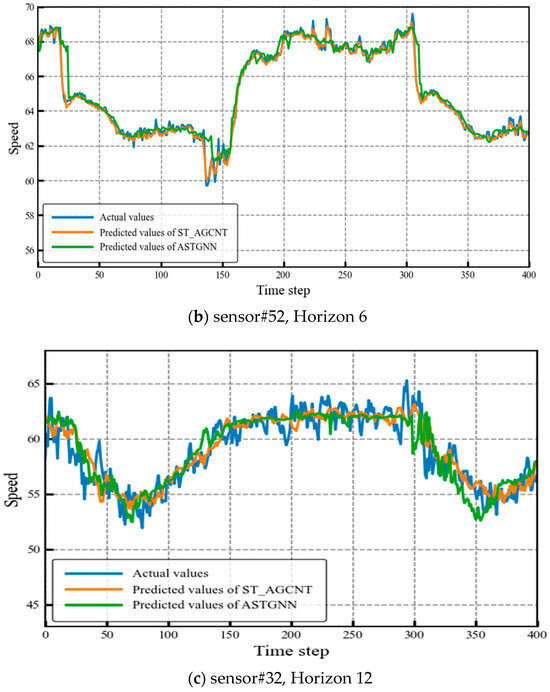 The prediction results of the baseline models and our model ST_AGCNT for 15 min (horizon 3), 30 min (horizon 6), and 60 min (horizon 12) predictions on the PEMS-08 dataset are shown in Table 2. Bold indicates the best performance for each prediction horizon. Overall, as the prediction horizon increases, the prediction errors of different models gradually increase. The ST_AGCNT model that we proposed surpasses the baseline models in performance across various horizons, delivering the highest results. For example, with a prediction horizon of 12, the ST_AGCNT model achieved a 7.8% improvement in MAE, a 6.4% improvement in RMSE, and a 7.5% improvement in MAPE compared to the most competitive baseline models.