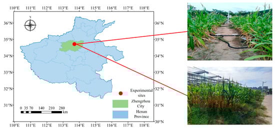 The field trials of this study were carried out in the agricultural water efficiency test field (34.78° N, 113.76° E, altitude 110 m) at the Longzihu Campus of North China University of Water Resources and Electric Power (see Figure 1). Located in central and northern Henan Province, it has a temperate monsoon climate with mild temperatures, hot and rainy summers, and cold and dry winters. The area has an average daily sunshine duration of 6.57 h, an average temperature range of 14.3–14.8 °C, a long-term average precipitation between 586 and 669 mm, and a frost-free period of 220 days, which makes it suitable for summer maize cultivation. The experimental field has a flat topography, with surface soil mainly composed of sandy loam. The soil bulk density was 1.44 g/cm3. The average soil organic matter concentration in the 0–80 cm layer was 833 mg/kg, quick-acting potassium was 105.3 mg/kg, quick-acting phosphorus was 10.6 mg/kg, and total nitrogen was 527 mg/kg.