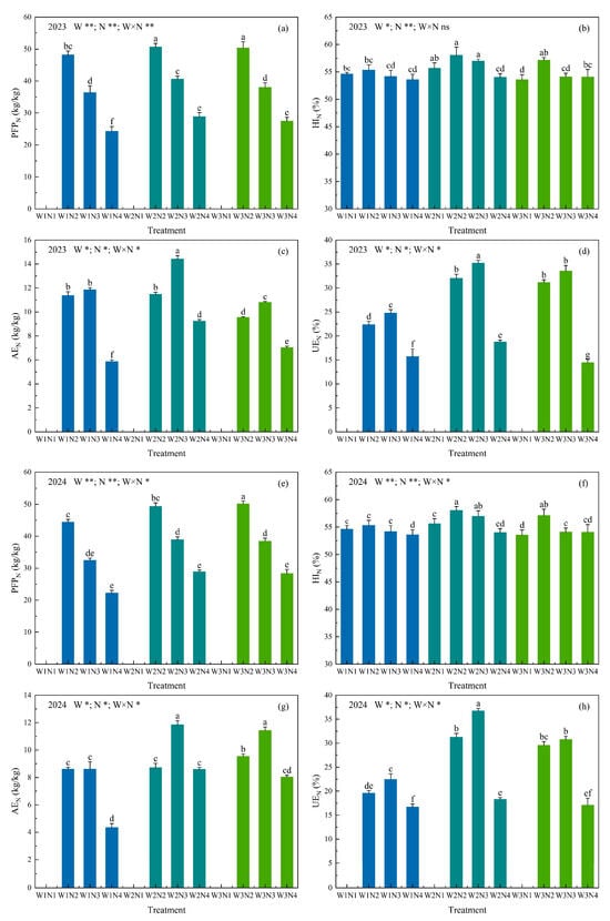 Impact of different water and nitrogen conditions on nitrogen fertilizer use in summer maize. Note: Different lowercase letters represent significant differences between treatments at the 0.05 level; W represents the effect of irrigation volume; N represents the effect of nitrogen application; W × N represents the influence of water–nitrogen interaction; ‘ns’ represents no significant difference; ‘*’ represents significance at p < 0.05; ‘**’ represents high significance at p < 0.01.