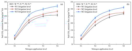 Impact of different water and nitrogen conditions on soil CO2 emission flux in summer maize. Note: W represents the effect of irrigation volume; N represents the effect of nitrogen application; W × N represents the influence of water–nitrogen interaction; ‘*’ represents significance at p < 0.05; ‘**’ represents high significance at p < 0.01.