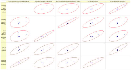 Figure 6 displays the results of the correlation study conducted on several service improvement metrics of private parcel companies. Correlation coefficients indicate the intensity and direction of the link between various metrics, revealing how the adoption of one measure may impact the others. The graphic depicts six primary elements: the expansion of the parcel transportation network, the implementation of a real-time feedback tool, the adoption of automation technologies (such as drones), the use of route optimization solutions, and the enhancement of staff skills.