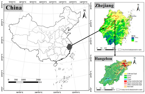 Hangzhou, the capital city of Zhejiang Province in China, is a mega city located in the Yangtze River Delta region (Figure 1). It is also the economic, cultural, and scientific center of Zhejiang Province. As of the end of 2023, the city’s permanent population reached 12.52 million, with an urbanization rate of 84.2%. Its topography is complex and varied, with an overall decline in elevation from west to east. The western, central, and southern parts of the city are characterized by low mountains and hills, while the northeastern part belongs to the northern Zhejiang plain. The city boasts a natural environment where rivers, lakes, and mountains converge, making it a typical and representative city within Zhejiang. Hangzhou’s urban development plays a key role in promoting coordinated growth in the Yangtze River Delta and serves as a guiding force for the development of other cities in the region.