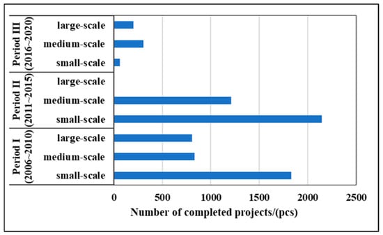 CLR in Hangzhou has unfolded across three distinct Five-Year Plan periods from 2006 to 2020: Period I (2006–2010), Period II (2011–2015), and Period III (2016–2020). These periods reflect a broader trend in urban land development that began with extensive land use adjustments, followed by optimization and final consolidation efforts. Analyzing the number and scale of reclamation projects during these periods provides insight into the city’s evolving approach to land management in the context of rapid urbanization (Figure 2).