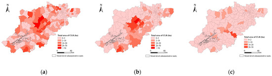 Total area of CLR in different planning periods: (a) is in Period I; (b) is in Period II; (c) is in Period III.