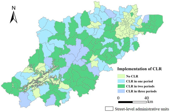 Based on the implementation of reclamation activities across the three planning periods, Hangzhou’s streets can be categorized into four types (Figure 4): streets with no CLR, streets with reclamation in one period, streets with reclamation in two periods, and streets with reclamation in all three periods. Notably, 78 streets experienced no CLR, primarily concentrated in central urban areas and key ecological protection zones, such as the regions around Qiandao Lake, which are preserved for their environmental value. Forty-two streets underwent reclamation in only one period, with small reclamation areas concentrated in urban–rural boundaries like Yuhang District, Lin’an District, and Fuyang District. These areas were constrained by the need to balance urban growth with agricultural and ecological preservation, limiting further reclamation. A larger group of 67 streets underwent reclamation in two periods, primarily in Lin’an District, Fuyang District, and Jiande City, where moderate reclamation activities were carried out in the earlier periods. These streets reflect a more stable phase of urban development, where initial reclamation efforts were followed by careful adjustments to land use, ensuring continued growth while managing environmental impacts. Finally, 12 streets with reclamation in all three periods typically exhibited significant agricultural production potential and were located in suburban districts like Tonglu County and Jiande City. These areas benefited from sustainable reclamation practices, allowing for the integration of production, living, and ecological functions, thus supporting balanced urban expansion in alignment with long-term development goals.