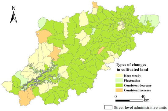 In contrast, nine streets experienced fluctuations in the total area of cultivated land, with these changes scattered across regions such as Qiantang District, Jiande City, and Chun’an County. These areas are generally situated farther from the urban center and are located along the urban–rural interface, where land use transitions between urban and agricultural areas are more dynamic. The fluctuations may reflect a combination of factors, including shifting agricultural practices, land reclamation efforts, as well as land use policies that occasionally promote agricultural preservation or expansion. Such areas, which are in close proximity to both urban developments and rural spaces, may experience periodic reversals in land use trends due to changing socio-economic pressures and land management strategies.