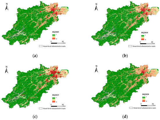Habitat Quality in Hangzhou City: (a) in 2005; (b) in 2010; (c) in 2015; (d) in 2020.