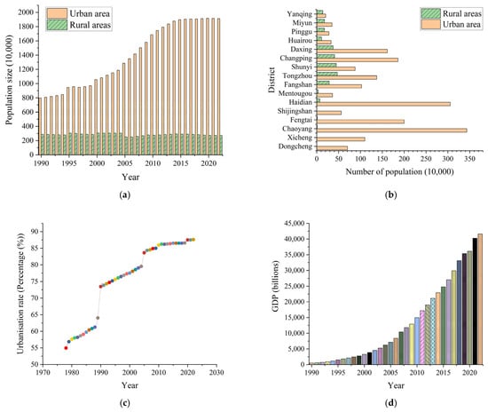 Basic statistical information for the urban–rural fringe in Beijing. (a) Population size; (b) population distribution in 2022; (c) urbanization rate; (d) GDP statistics; (e) percentage of tertiary sector; (f) changes in the number of villages; (g) disposable income of the population.