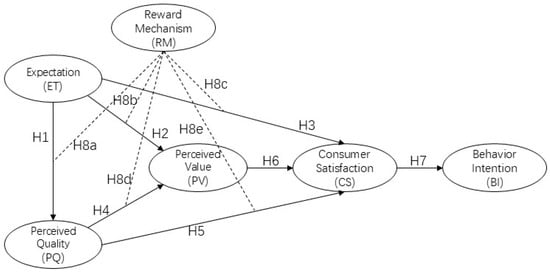 25]. Therefore, in this paper’s model construction, we innovatively utilize the reward mechanism as a moderating variable. This mechanism influences consumers’ emotional responses, thus modulating the relationship between perceived value and consumer satisfaction.