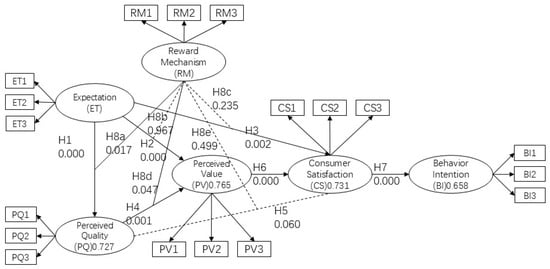 p < 0.05), thus supporting Hypothesis H8a. The path coefficient of consumer expectations on perceived quality is 0.517, while the path coefficient of the reward mechanism as a moderating variable on expectations and perceived quality is 0.117, both being positive. This indicates that the reward mechanism positively moderates the relationship between consumer expectations and perceived quality [