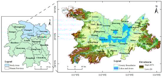 The DLEEZ(28°30′–30°23′ N, 110°40′–113°10′ E) is situated in the middle reaches of the Yangtze River, with a complex topography, including broad alluvial plains, lake systems, and neighboring mountains and hills. The region features a subtropical monsoon climate, with an average yearly temperature ranging from 16.4 to 17.0 °C and an annual precipitation averaging between 1200 and 1550 mm. The climate and topography provide excellent conditions for agricultural development, and the DLEEZ is an important commodity grain and aquaculture base in China, which is known as the “land of fish and rice” [18]. Moreover, Dongting Lake is the second-largest freshwater lake and a typical river-connected lake in China. Its substantial biodiversity has earned it recognition as one of the 200 global conservation priority eco-regions in the world [24].
