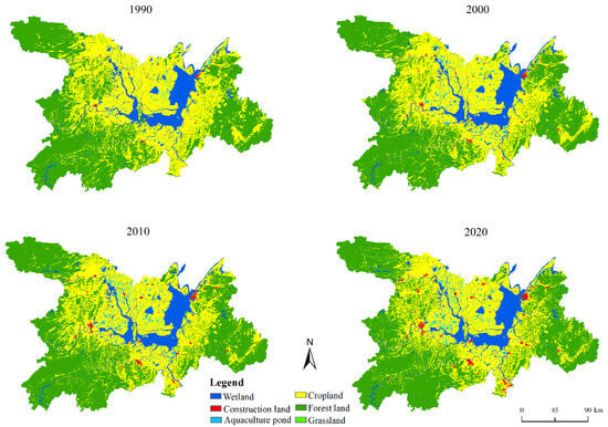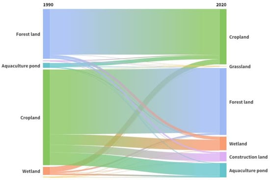 From 1990 to 2020, forest land, cropland, and wetland were consistently the main land-use types in the region, accounting for nearly 90% of total area (Table 2). Notably, the area of wetland increased from 1990 to 2020, with a large increase of 226.14 km2 from 1990 to 2010. The cropland area decreased, by a total of 1787.55 km2 over the past 30 years. The area of forest land increased, with a large increase of 564.3 km2 from 2000 to 2010. The area of aquaculture ponds and construction land exhibited increasing trends. In particular, the area of aquaculture ponds increased by 398.01 km2 from 1990 to 2010, and the construction land area increased by 374.29 km2 over the past 30 years.