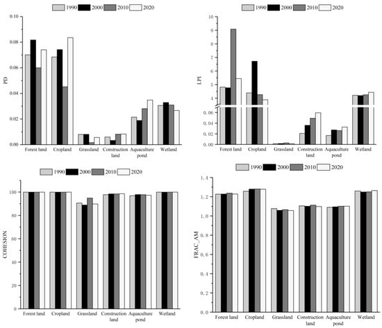 The fluctuation in the Patch density (PD) of forest land and cropland from 1990 to 2020 was larger than that of other land-use types, indicating that the degree of fragmentation of forest land and cropland was more serious (Figure 4). Wetland generally showed a trend of decreasing fragmentation, aquaculture ponds tended show increasing fragmentation, and the PD of construction land and grassland were small, with a small degree of landscape fragmentation. The largest patch index (LPI) of cropland, forest land, and wetland were much larger than those of other land-use types, indicating that these three types were consistently the dominant landscape types in the DLEEZ. The LPI of forest land and cropland fluctuated greatly, with forest land reaching a peak of 9.18% in 2010 and cropland reaching a maximum of 6.44% in 2000. In addition, the LPI of construction land increased over time, and its area expanded, indicating that construction land expanded in an aggregated manner. Forest land, cropland, and wetland had aggregation levels of greater than 99% between 1990 and 2020, indicating that they were highly spatially aggregated with high connectivity. Forest land, cropland, and wetland had larger FRAC_AM values, indicating that they were more irregularly distributed than other land-use types.
