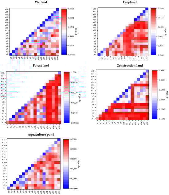 From the single-factor perspective (Table S5), the explanatory power of socio-economic factors on the areas of wetland, cropland, and construction land was significantly greater than that of natural factors, which shows that anthropogenic activity posed a greater threat to wetland and cropland than natural factors during the period 1990–2020. Based on the q-value size ranking and p-value significance test (p < 0.05), the main factors affecting wetland were the output value of primary industry and potential evapotranspiration. The factors that had a greater impact on cropland were the output value of primary industry, effective irrigated area of agriculture, sown area of crops, and output value of agriculture. The dominant driving forces of forest land were elevation, slope, temperature, and population density. The factors with the greatest explanatory power for construction land were urbanization, output value of secondary and tertiary industries, population density, GDP, and total retail sales of social consumer goods. The main factors affecting aquaculture ponds were output value of fisheries, slope, and elevation.