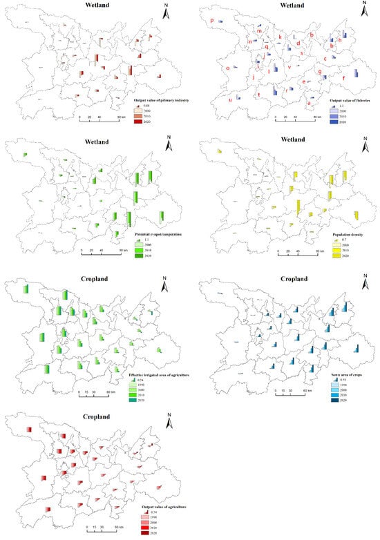 The mean regression coefficients of core factors for wetland and cropland (Changsha City: a = Wangcheng. Yueyang City: b = Junshan, Yueyanglou, and Yunxi; c = Yueyang; d = Huarong; e = Xiangyin; f = Pingjiang; g = Miluo; h = Linxiang. Changde City: i = Wuling; j = Dingcheng; k = Anxiang; l = Hanshou; m = Lixian; n = Linli; o = Taoyuan; p = Shimen; q = Jinshi. Yiyang City: r = Heshan; s = Nanxian; t = Taojiang; u = Anhua; v = Yuanjiang).