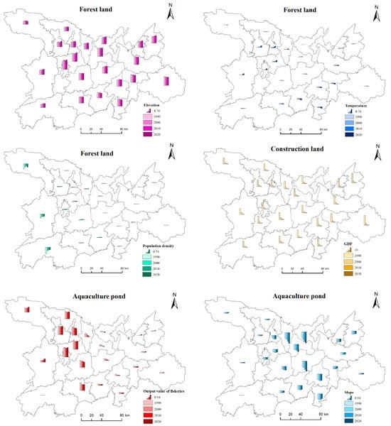 The elevation (0.994) dominated the influence on forest land, and temperature (−0.020) and population density (−0.097) had mainly negative effects on forest land (Figure 7). The areas with larger absolute regression coefficients of population density were mainly Shimen, Taoyuan, and Anhua. Temperature and forest land area showed a positive correlation in Linli, Jinshi, and Dingcheng and a negative correlation in Yiyang, Xiangyin, Miluo, and Wangcheng. The positive effect of elevation and temperature on forest land increased, and the effect of population density decreased from 1990 to 2020. GDP was significantly correlated with construction land with a mean regression coefficient of 8.227. The regression coefficients of all regions were significantly higher in 1990 than in other periods, after which the positive effect of GDP on construction land decreased rapidly with time.
