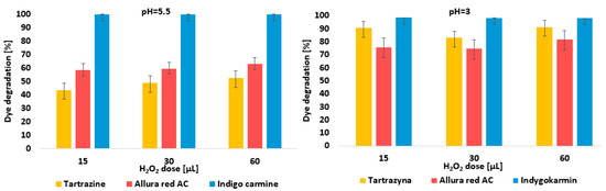 The influence of pH (5.5 and 3) and the H2O2 dose on the removal efficiency of Indigo carmine, Tartrazine, and Allura red AC dyes (Fe2+ dose: 1 mg, reaction time: 5 min, volume samples: 50 cm3, dye concentration: 50 mg/dm3).
