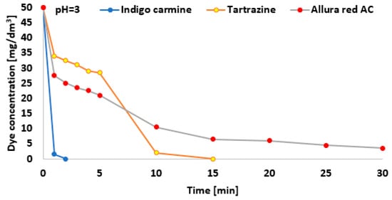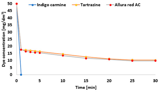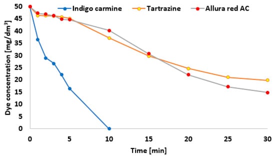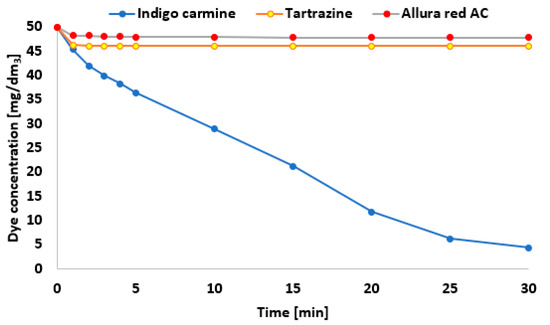 Oxidation reactions were carried out on a 4-station magnetic stirrer at a constant stir-ring speed of 100 rpm under ambient conditions (ambient temperature, atmospheric pressure). The beakers with a capacity of 100 cm3 were filled with 50 cm3 of solutions of Indigo carmine/Tartrazine/Allura red AC dyes at a concentration of 50 mg/dm3. Each process was carried out at the initial pH value of the dye solutions (5.5) and using a pH correction to a value of 3 ± 0.2 using a hydrochloric acid solution. The first stage of the study consisted of evaluating the effectiveness of the oxidation process of the dyes tested by adding 30% hydrogen peroxide in the form of hydrogen peroxide to the individual solutions at a dose of 15, 30, and 60 µL. The oxidation processes of the mixture containing Indigo carmine, Tartrazine, and Allura red AC were carried out for 30 min. After this time, the samples were collected and neutralized with sodium hydroxide solution and then analyzed.