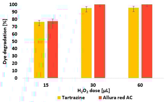 The same reaction parameters (Fe2+ dose: 2 mg, H2O2 doses: 15, 30, 60 µL, pH: 3) were used in the elimination process of the Allura red AC dye. A higher catalyst dose along with the use of 15 µL H2O2 slightly improved the efficiency of the process (an increase of 1.5%). The lower oxidizing power of Fenton’s reagent in the processes in which the lowest dose of H2O2 was used was probably due to an insufficient amount of oxidant compared to the catalyst dose used [55]. Low concentrations of hydrogen peroxide can result in a smaller amount of free radicals generated and, consequently, a slower rate of oxidation of pollutants [56]. A significantly higher reduction level was observed in the concentration of Allura red AC dye in the reaction using 30 and 60 µL of hydrogen peroxide (an increase of 25.5% and 18.5%, respectively).