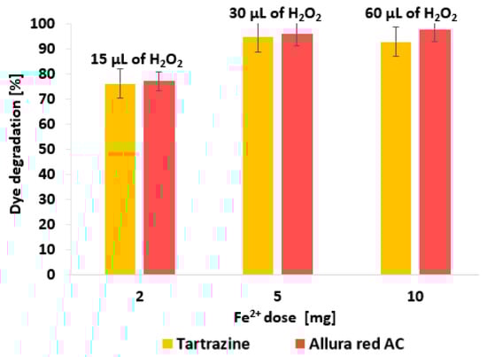Further processes for Tartrazine and Allura red AC dyes were performed using a higher catalyst dose (5 and 10 mg of Fe2+ ions). The remaining process parameters remained unchanged. It was noted that increasing the Fe2+ dose resulted in a slight deterioration of the decolorization effects or inhibition of the reaction (Figure 5). For example, for the degradation process of Tartrazine and Allura red AC dyes using 10 mg of Fe2+ (instead of 2 mg) and 60 µL of H2O2, the decrease in efficiency was 2.4% and 2.0%, respectively. The results obtained are consistent with the reports in the literature [28,35,39,66], which show that an increase in the concentration of iron (II) ions increases the degree of removal of organic compounds, but only to a certain level. Above the optimal concentration of the catalyst present in the reaction medium, Fe2+ ions can act as radical scavengers by reacting with the formed •OH. This leads to the inhibition of the further oxidation of pollutants or even a decrease in efficiency. For example, Mandal et al. (2010) [67] in the Fenton process, by increasing the catalyst dose four times, obtained a 2.8-fold increase in COD reduction efficiency (at pH 3.5 and reaction time: 24 h). An additional increase in the amount of Fe2+ (above 6 mg/dm3) resulted in a slight decrease in efficiency.