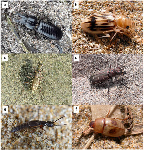 Coleoptera species suitable for use as indicators of the environmental condition of the beach in the Mediterranean coast: (a) Scarites laevigatus (ssp. venetianus); (b) Eurynebria complanata (image: courtesy of the author, M. Romano); (c) Cylindera trisignata (image: courtesy of the author, M. Baldin); (d) Calomera littoralis; (e) Cafius xantholoma (from Zanella et al. [50], with permission of the author, F. Barbieri); (f) Phaleria bimaculata.