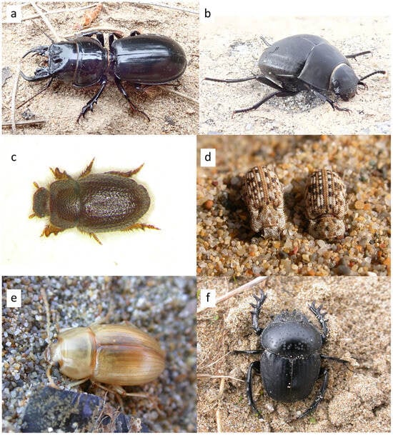 Among iconic species, some large dung beetles are easily observed while moving across the sand, rolling a dung ball, which they later bury and deposit an egg inside. These include the Mediterranean species Scarabaeus semipunctatus (14–28 mm, Figure 4f), which is in significant decline [4,53,96,117,118].