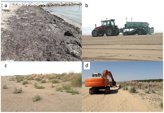 Impact of the cleaning interventions: (a) Deposit of stranded wrack (mainly composed of Zostera marina leaves) in the intertidal zone; (b) Mechanical beach cleaning operations (grooming) in the beach; (c) Pioneer vegetation freely developed on the embryonic dunes; (d) Embryonic dune alteration as a result of cleaning activities.