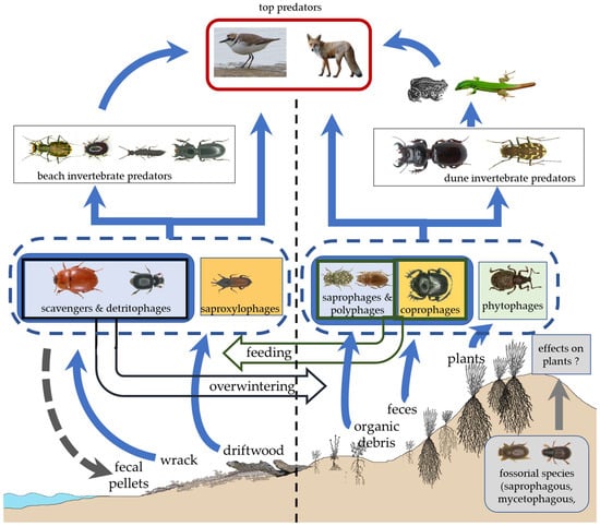 Schematic diagram of the primary trophic interactions involving the beetle fauna of the dune–beach ecosystem. Blue arrows indicate the flow of metabolizable energy and organic carbon through the trophic chain. The dashed grey arrow indicates the significant amount of shredded and partially digested organic matter, enriched with bacteria, that detritivorous beetles reintroduce into the environment in the form of fecal material. The dashed line boxes group together beetles that serve as food for intermediate predators and, at least partially, for top predators. Horizontal empty arrows indicate the movement of specific beetle groups beyond their typical activity zones for feeding or overwintering. The interactions between fossorial saprophagous/mycetophagous beetles and the plant biota remain to be understood. The images used, unless owned by the authors or used with permission, have been made available for free use by their respective creators without attribution requirements under the Pixabay.com license.