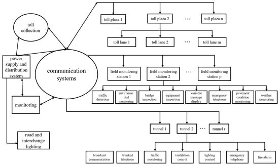 The power facilities and equipment along highways are integral to transportation infrastructure and serve as primary tools for advancing the digitalization and intelligence of highways. These facilities form a comprehensive system grounded in electronic, electrical, control, communication, mechanical, and traffic engineering technologies. They include subsystems such as monitoring, tolling, communication, lighting, power distribution, and tunnel electromechanical systems, which are interconnected via communication networks [19], as shown in Figure 1.