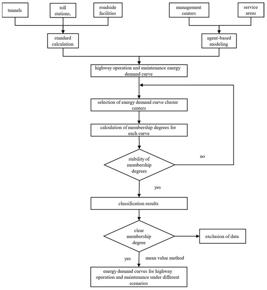 Given the dynamic and stochastic nature of highway infrastructure and service capabilities during operation and maintenance, understanding energy demand patterns and load dynamics is vital for developing self-sufficient and energy-resilient transportation systems. Agent-Based Modeling (ABM) is a computational simulation environment that can represent complex systems of interacting agents and their behaviors. This modeling approach can be combined with qualitative scenarios to elucidate potential futures in specific contexts. Although ABM has been widely used in fields such as agriculture, business, and health research [13,14,15,16,17,18], few have applied it to the highway sector. This study establishes a dynamic energy demand forecasting model based on the consumption characteristics of diverse scenarios in highway operation and maintenance systems. Using ABM and fuzzy C-means (FCM) clustering, this research classifies energy demand under scenarios such as major holidays, snowfall, and extreme weather. The findings provide comparative analyses of energy consumption patterns and load variations, calculating storage capacity requirements across different scenarios to support energy system resilience under external disruptions.