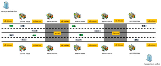 A highway network structure is defined, as illustrated in Figure 5. The highway is unidirectional, with a total length of 300 km, a design speed of 100 km/h, a roadbed width of 26 m, two long tunnels (each 3500 m in length), ten type II service areas, twelve toll stations, and two operation management centers. Based on traffic flow data from literature [1,27,28,29,30,31] and measured data from highways in Western China, the corresponding simulation scenarios are constructed, incorporating traffic flow and meteorological information.